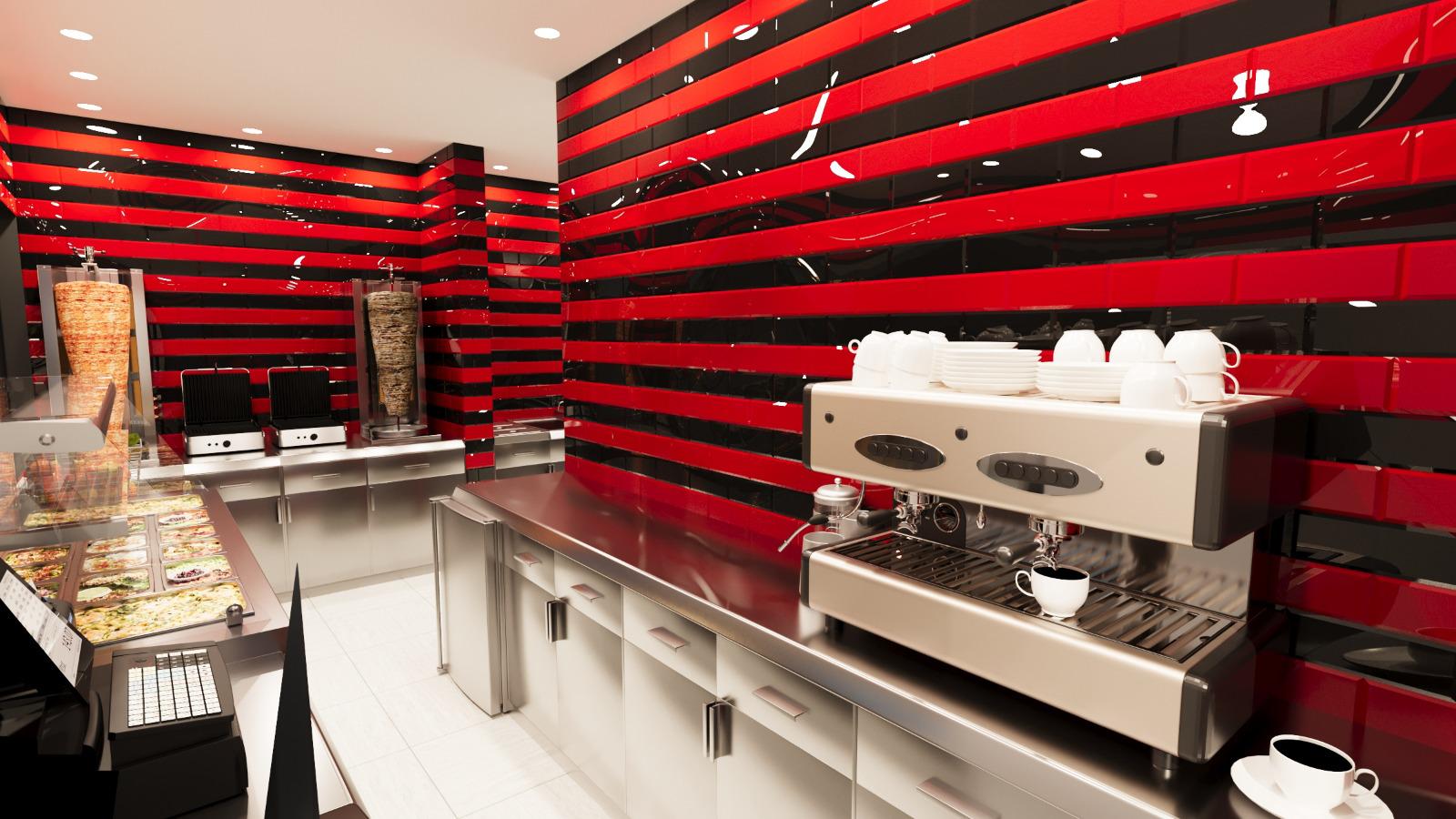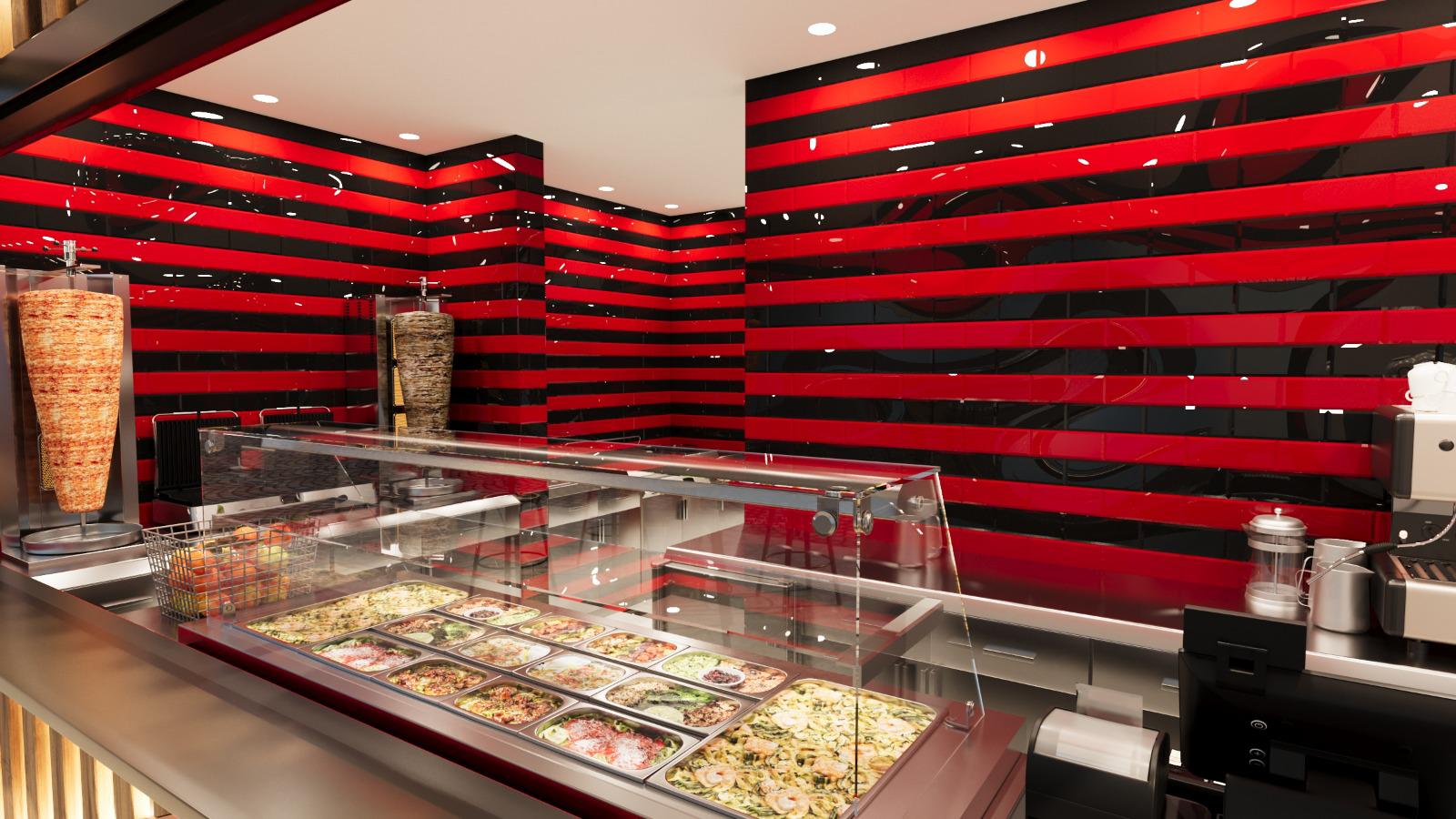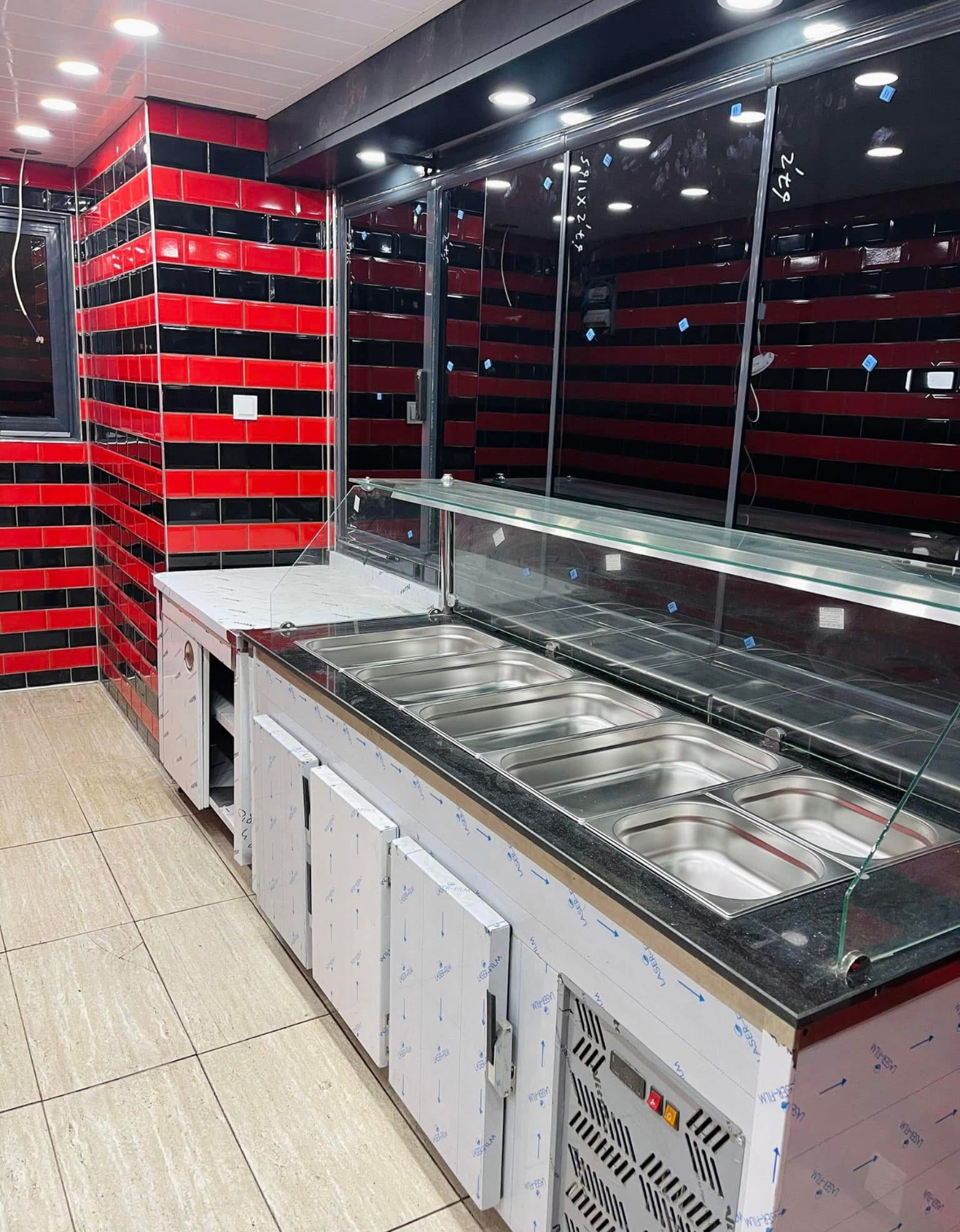 Nach Anschluss der Medien und kurzer Einweisung kann der Betrieb aufgenommen werden. Alle Einbauten (Theken, Kühltechnik, RK-Systeme) sind betriebsfertig montiert.